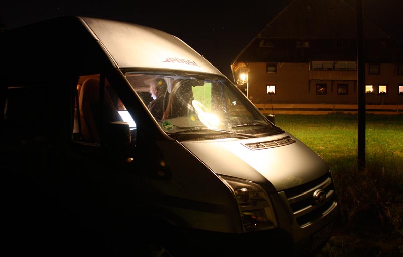 Die Routenplanung von Google-Maps in Verbindung mit unserem GPS-Empfänger erfüllte ihren Zweck, und gegen 20:30 rollten wir auf dem Michelhof ein, ein einsamer Hof mit eigener, hölzerner Kapelle und Teich. Sehr idyllisch. Ruhe. Dunkelheit. Anmeldung im Restaurant. Unkompliziert werden wir an unseren Platz gewiesen. Dauercamper als Nachbarn, die hier schon 20 (zwanzig) Jahre stehen.