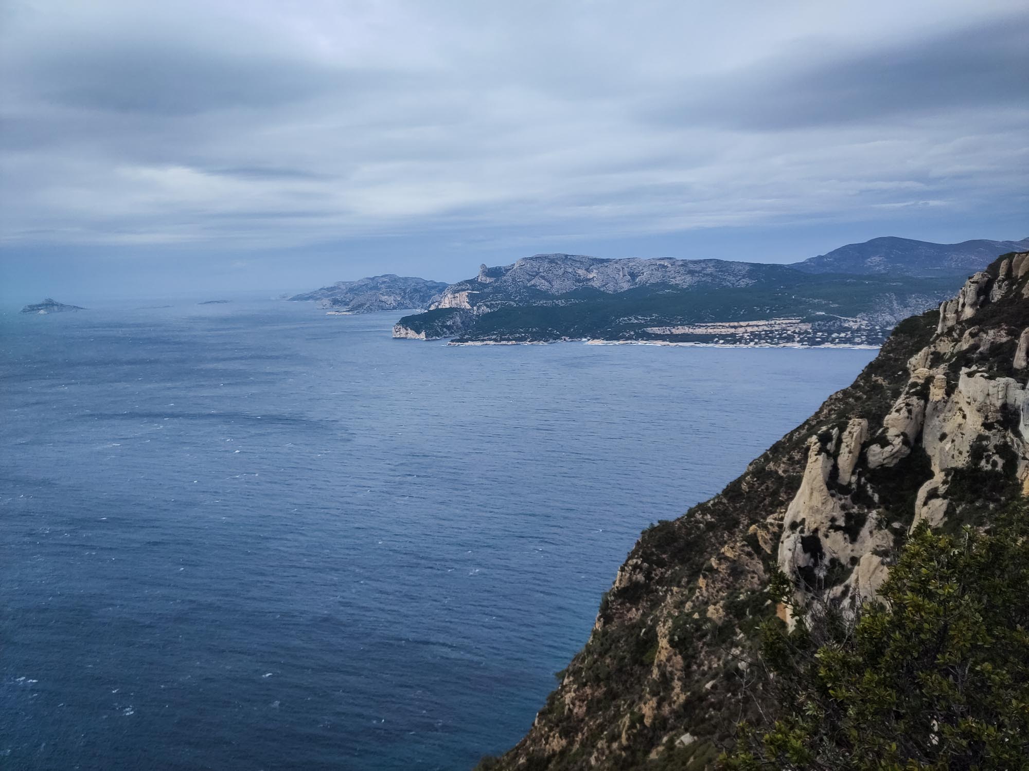 Ein ganz anderer Ausflug war für den nächsten Tag geplant: die Route des Crêtes verbindet Le Ciotat und Cassis über eine rund 17 km lange, wenig befahrene Passstraße, die bis auf 399 Meter hochführt und perfekt für eine E-Bike-Tour geeignet schien. Akkus nur auf 92 %, aber was soll’s, wird schon reichen … nun ja. Von Regen blieben wir weitestgehend verschont, aber der Wind blies ganz schön heftig. Aber die Blicke! Anders als erwartet fährt man nicht die ganze Zeit mit Blick aufs Meer, eher im Gegenteil, die Serpentinen ziehen sich an den Bergkuppen aber zwischendurch kann man anhalten und auf die Buchten schauen – einmal sogar gleichzeitig auf Le Ciotat und Cassis. Ganz ehrlich: zwischendurch hatte ich etwas Muffensausen. Der Akku zog sich schneller als je leer, und der Wind in Kombination mit steil abfallenden Kanten … sollten wir nicht doch lieber umkehren? Schließlich hatten wir die heftigsten Steigungen hinter uns gebracht, aber die Abfahrt nach Cassis runter (30%!!!) hatte es auch noch mal in sich. Demnächst mal Bremsen checken lassen. Die Rückfahrt hatten wir uns sowieso schon mit der Bahn überlegt, wobei der Bahnhof in Cassis wieder deutlich weiter oben liegt …
