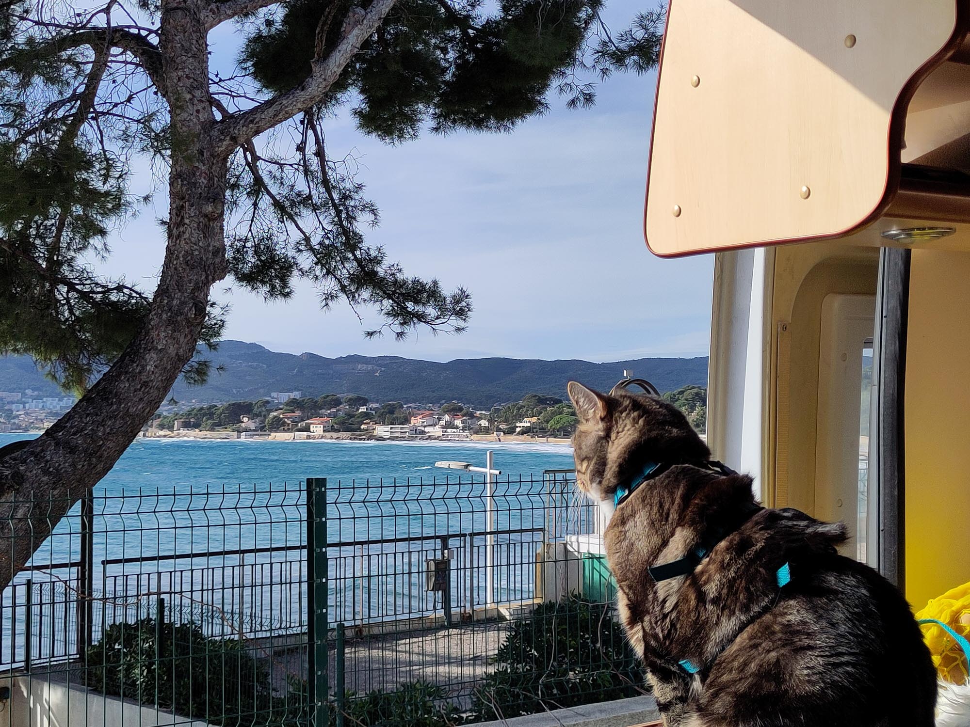 Und schon waren die ersten Tage vorbei und wir wollten diesmal unbedingt Sanary-sur-Mer sehen, aus Gründen. Eine kleine Stadt vor Toulon, die während der Zeit des Nationalsozialismus zum Fluchtort viele Intellektueller und Künstler wurde, aber auch vorher schon expressionistische Maler angezogen hatte. Die Gemälde hatten mich neugierig gemacht, und wir hatten überlegt, nur kurz anzuhalten und dann auf einen Platz in Toulon weiterzufahren. Wie so oft kämpften wir mit der Parkplatzsituation und landeten dann doch auf einem Stellplatz, den ich als „nicht so attraktiv“ eigentlich verworfen hatte. Die YMCA hat hier eine riesige Ferienanlage (im Winter fast komplett leer) und bietet zusätzlich ein paar Womo-Stellplätze an. Supersympathisches Personal, offene Duschen, Wasser am Platz, Strom … wir blieben gleich mehrere Nächte, denn auch von Sanary kann man prima mit der Bahn die Küste rauf und runter fahren. Sehr entspannt und die Katers hatten fast einen Wald für sich.